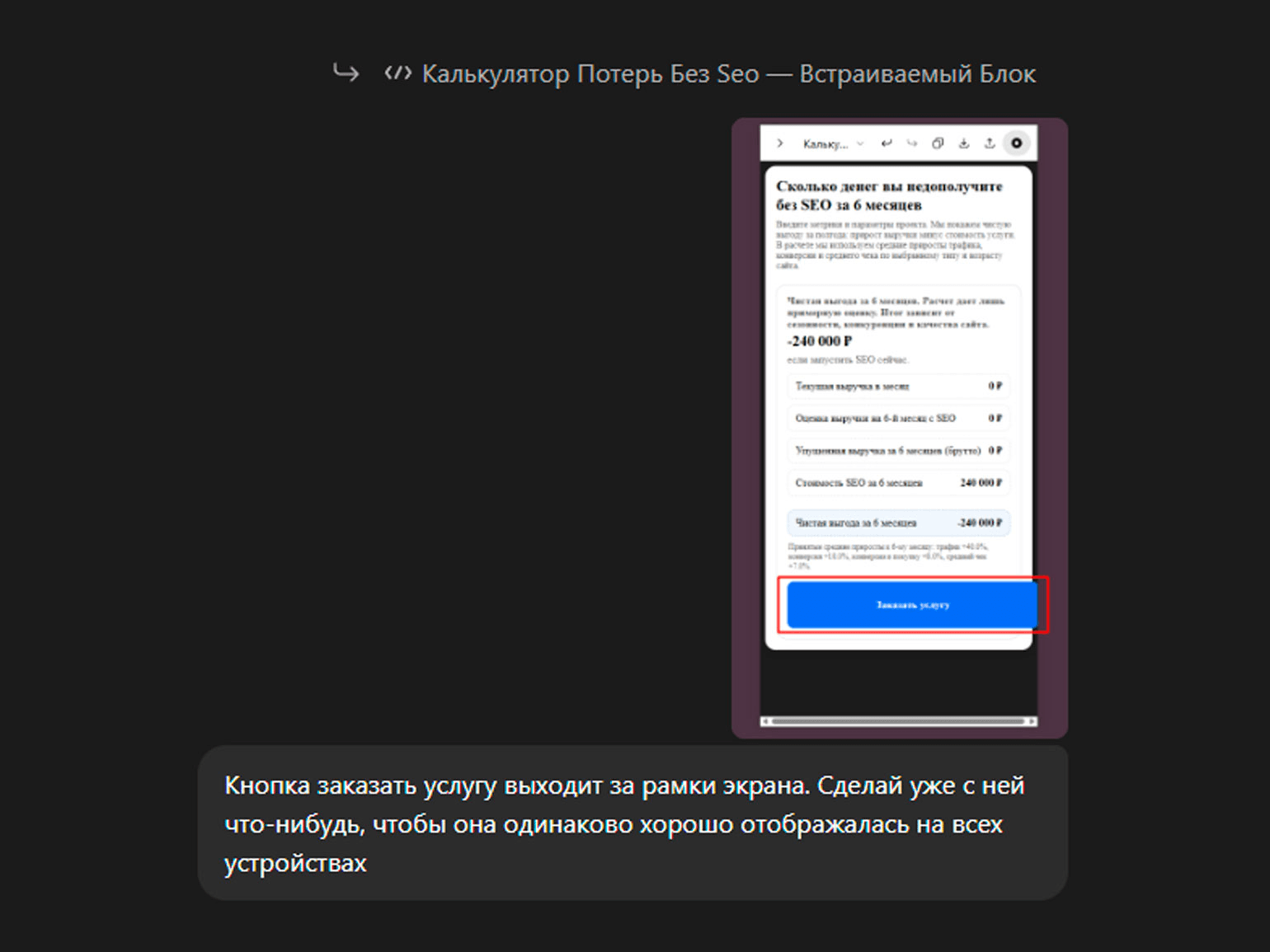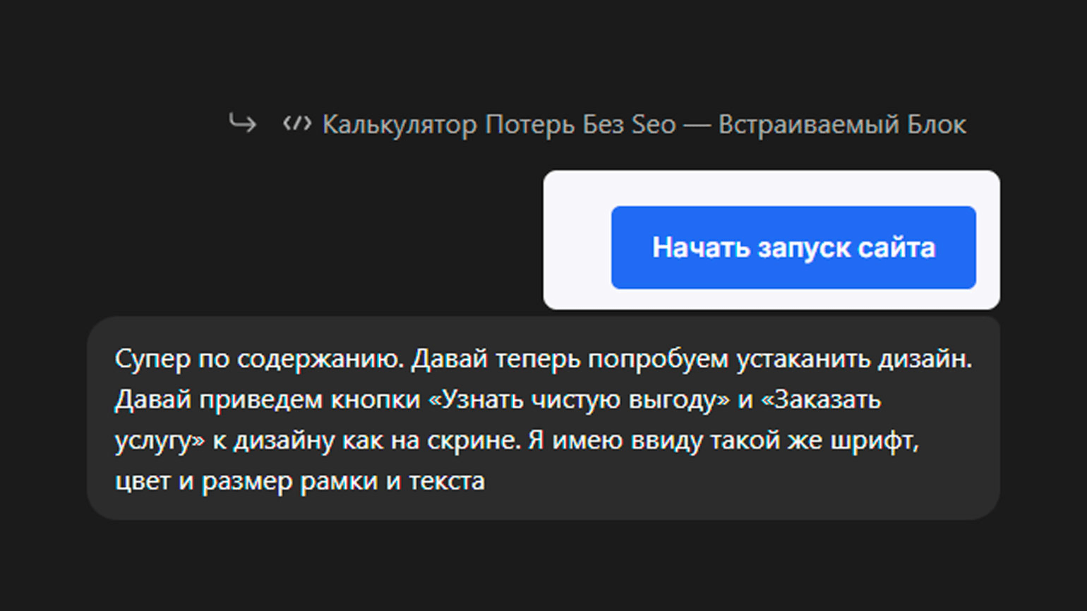 Если делаете блок для сайта, нужно, чтобы дизайн блока соответствовал общей стилистике. Для этого достаточно скинуть в чат с ИИ скриншот одной из страниц сайта, и нейросеть сама подберёт подходящие стили.