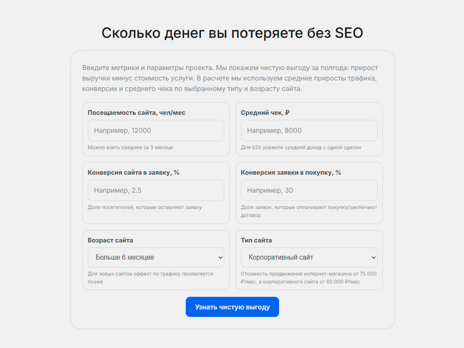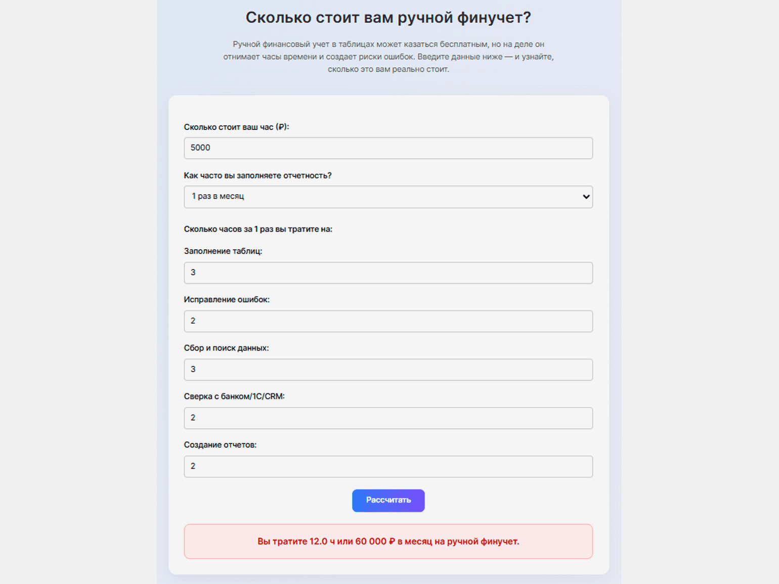 Для нашего финансового направления мы создали простой калькулятор, позволяющий рассчитывать затраты на финучёт. Цель — быстро показать преимущество нашего сервиса перед ручным ведением Excel-таблиц. Программиста привлекали только для вёрстки страницы.