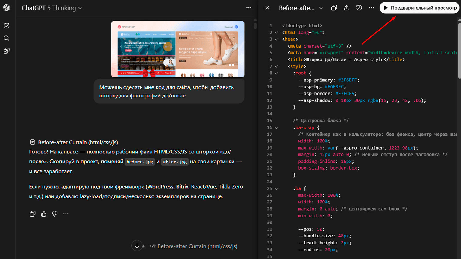 Результат можно отслеживать прямо в чате с помощью предварительного просмотра. Если что-то не устраивает, вносите текстовые корректировки и проверяйте, что изменилось в коде.